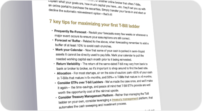 Structuring your first T-Bill ladder 7 key tips for maximizing your first T-Bill ladder Frequently Re-Forecast - Revisit your forecasts every few weeks or whenever a major event occurs to ensure your assumptions are still correct.v Forecast w/ Buffer - Related to the above, when forecasting remember to add a buffer of at least 10% to avoid cash crunchesU Mark your Calendar - Now that some of your cash is parked in semi-illiquid assets it cannot be directly used to pay bills. Mark your calendar to pull the needed working capital each month prior to it being reinvested.v Return Variability - The return of the same-dated T-bill may vary from bank to bank or broker to broker, so it’s important to shop around to find the best rateU Allocation - For most startups, air on the side of caution: park <50% of your cash in T-Bills that mature in 6+ months, and 50%+ in T-Bills that mature in >6 monthsU Consider ETFs over T-bill Ladders - We’ve made the case once, and we’ll make it again— the time–savings, and peace of mind that T-Bill ETFs provide are well worth the opportunity cost of the minimal upsideU Consider Treasury Management Platform - Rather than managing the Tbill ladder on your own, consider leveraging a treasury management platform, that automates the cash sweeping and investment process. If you’re looking for a partner to help walk you through the entire process, check out Arc Gold. It helps startups put their treasury management on autopilot, comes with up to $2.75M FDIC insurance, $500k of SIPC coverage, and pays up to 5.00% APY.