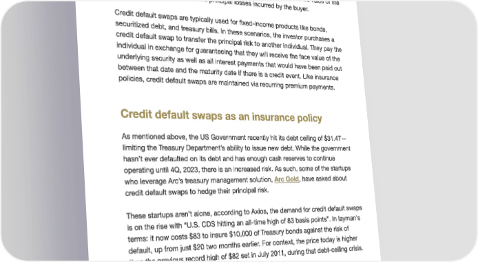 An overview of credit default swaps Credit default swaps as an insurance policy As mentioned above, the US Government recently hit its debt ceiling of $31.4T— limiting the Treasury Department’s ability to issue new debt. While the government hasn’t ever defaulted on its debt and has enough cash reserves to continue operating until 4Q, 2023, there is an increased risk. As such, some of the startups who leverage Arc’s treasury management solution, Arc Gold, have asked about credit default swaps to hedge their principal risk. These startups aren’t alone, according to Axios, the demand for credit default swaps is on the rise with “U.S. CDS hitting an all-time high of 83 basis points”. In layman's terms: it now costs $83 to insure $10,000 of Treasury bonds against the risk of default, up from just $20 two months earlier. For context, the price today is higher than the previous record high of $82 set in July 2011, during that debt-ceiling crisis. Even though there is an increased risk of default today and demand for credit default swaps is on the rise, it’s important to note that U.S. Treasuries are considered one of the most risk-free assets in the financial world. Axios says “they're the bedrock on which almost everything else is constructed. The U.S. can always print the money it needs to repay its debts.” We tend to agree.