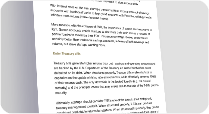 T-Bills importance in treasury management As mentioned in chapter two, the goal of a treasury management strategy is to minimize risks and maximize returns. This is accomplished through a variety of actions, which include the allocation of capital. Prior to this year, most startups allocated their funds across primary accounts, which they used for day-day operations, and savings accounts, which they used to store excess cash. With interest rates on the rise, startups transferred their excess cash out of savings accounts with traditional banks to high-yield accounts with Fintechs, which generate infinitely more returns (100x+ in some cases). More recently, with the collapse of SVB, the importance of sweep accounts came to light. Sweep accounts enable startups to distribute their cash across a network of partner banks to maximize their FDIC insurance coverage. Sweep accounts are certainly better than traditional savings accounts, in terms of both coverage and returns, but leave startups wanting more. Enter Treasury bills. Treasury bills generate higher returns than both savings and operating accounts and are backed by the U.S. Department of the Treasury, an institution that has never defaulted on its debt. When structured properly, Treasury bills enable startups to capitalize on the upside of rising rate environments, while effectively covering 100% of their excess cash. The only downside is the limited liquidity (e.g. the date of maturity) and the principal losses that may ensue due to the sale of the T-Bills prior to maturity. Ultimately, startups should consider T-Bills one of the tools in their metaphoric treasury management tool belt. When structured properly, T-Bills can produce consistent predictable returns for startups. When structured improperly, they can be disastrous—causing not only principal losses but also complete cash lock-ups and inaccessibility of reserves. Check out the next chapter for structuring T-Bill ladders to balance returns & liquidity.